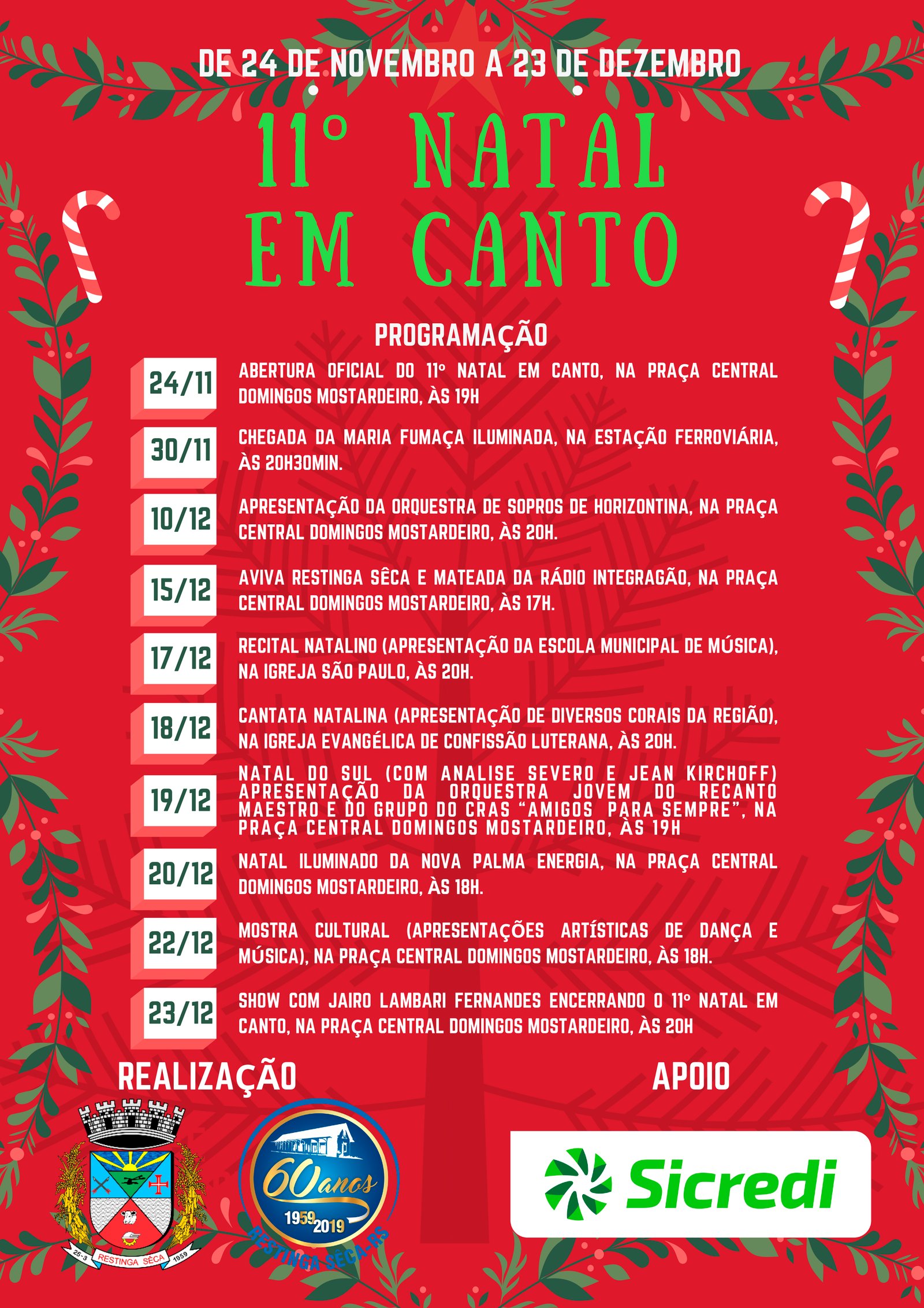 Restinga Sêca vive as comemorações do 11° Natal em Canto. Música, alegria, dança e muita emoção fazem parte da programação que segue até o dia 23 de dezembro.