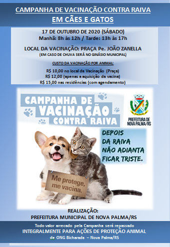 No sábado, dia 17 de outubroa Prefeitura Municipal de Nova Palma realizará na Praça Padre João Zanella a Campanha de Vacinação contra raiva em cães e gatos. A vacinação será pela manhã, das 8h às 12h, e à tarde, das 13h às 17h. Em caso de chuva a vacinação acontecerá no Ginásio Municipal.