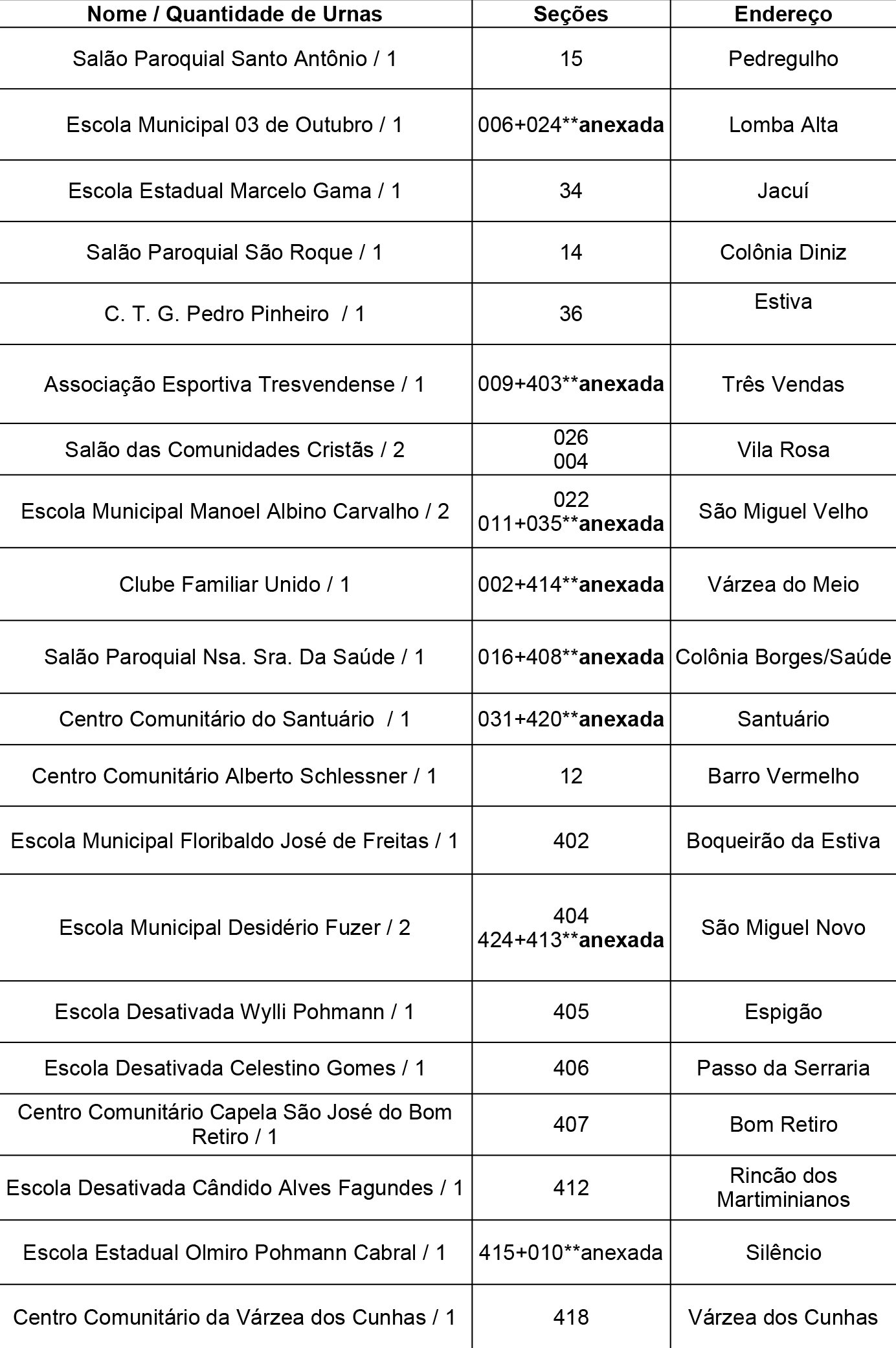E os eleitores da seção 413 – Escola Municipal Maximiliano Druzian – São Sebastião passarão para a seção 424 – Escola Municipal Desiderio Fuzer – São Miguel Novo.