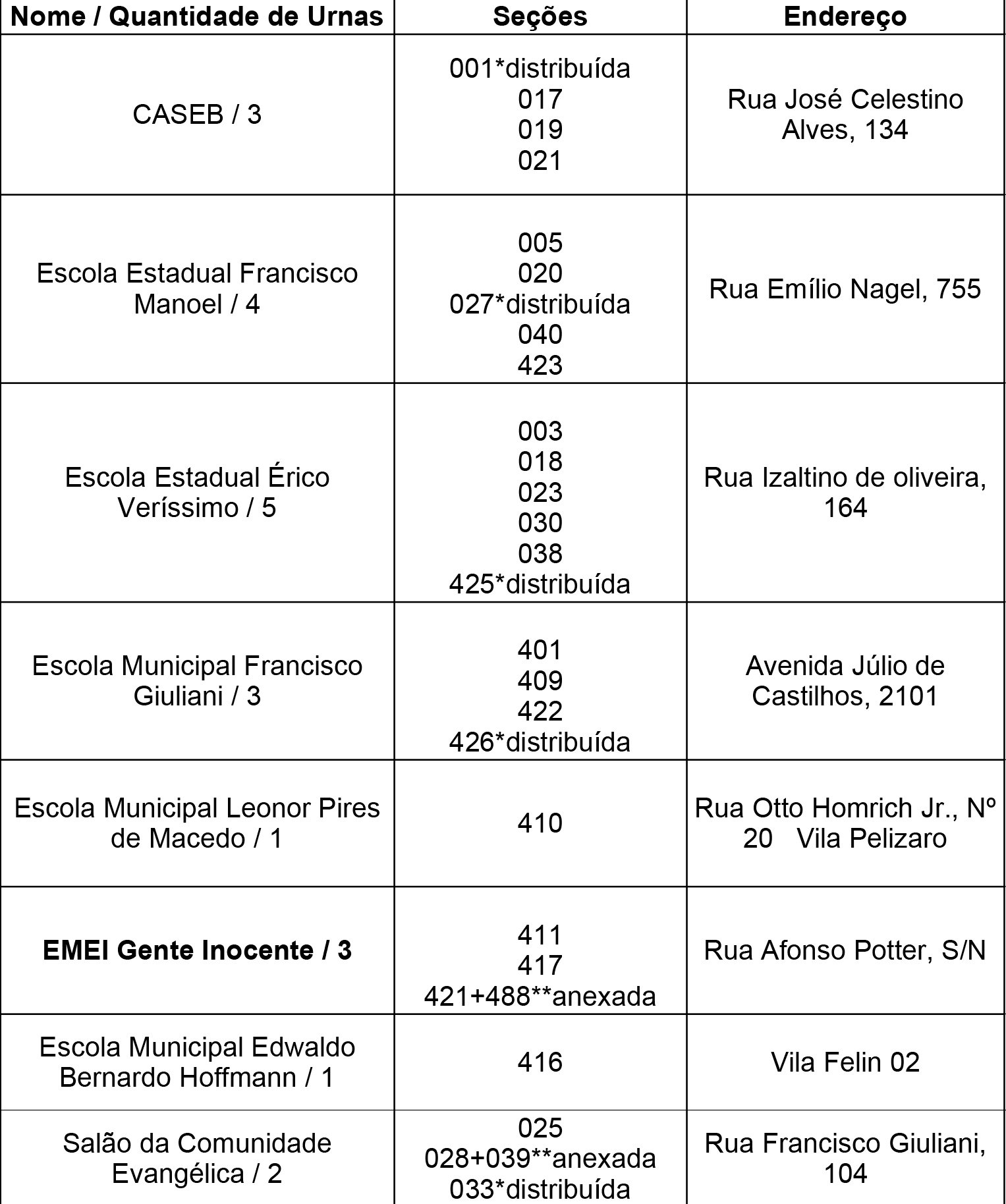 Serão distribuídas as seções 001 (Salão Paroquial), 027 (Escola Francisco Manoel), 425 (Escola Erico Veríssimo), 426 (Escola Francisco Giuliani) e 033 (Salão da Comunidade Evangélica) – seus eleitores foram distribuídos nas outras seções do mesmo local. Os eleitores votarão normalmente na urna eletrônica da seção para a qual estarão distribuídos. Haverá orientação no local de votação.