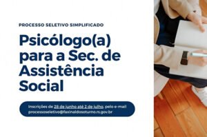 A Prefeitura de Faxinal do Soturno está realizando um processo seletivo simplificado para a contratação temporária de um psicólogo para atuar junto à Secretaria Municipal de Assistência Social. As inscrições iniciaram nesta segunda-feira, dia 28. Entre os requisitos para participar da seleção, que se dará por meio de estudo de currículo, estão o Ensino Superior … Continue reading “Prefeitura de Faxinal do Soturno abre processo seletivo para contratação de Psicólogo”