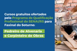 Os cursos de Pedreiro de Alvenaria e Carpinteiro de Obras, do Programa de Qualificação Profissional do Serviço Nacional de Aprendizagem Industrial do Rio Grande do Sul (SENAI/RS), serão ofertados em Faxinal do Soturno pelo Projeto Escola de Formação, do Centro de Referência de Assistência Social (CRAS) da Secretaria de Assistência Social, em parceria com o … Continue reading “Cursos de Pedreiro de Alvenaria e Carpinteiro de Obras serão ofertados gratuitamente em Faxinal do Soturno”