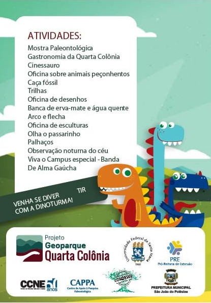 Inicialmente o evento estava marcado para o dia 19, mas foi transferido para este sábado, dia 26, devido a chuva na última semana. O 3º Paleodia será das 15h às 21h, no Centro de Apoio à Pesquisa Paleontológica (Cappa) da UFSM, localizado em São João do Polêsine.