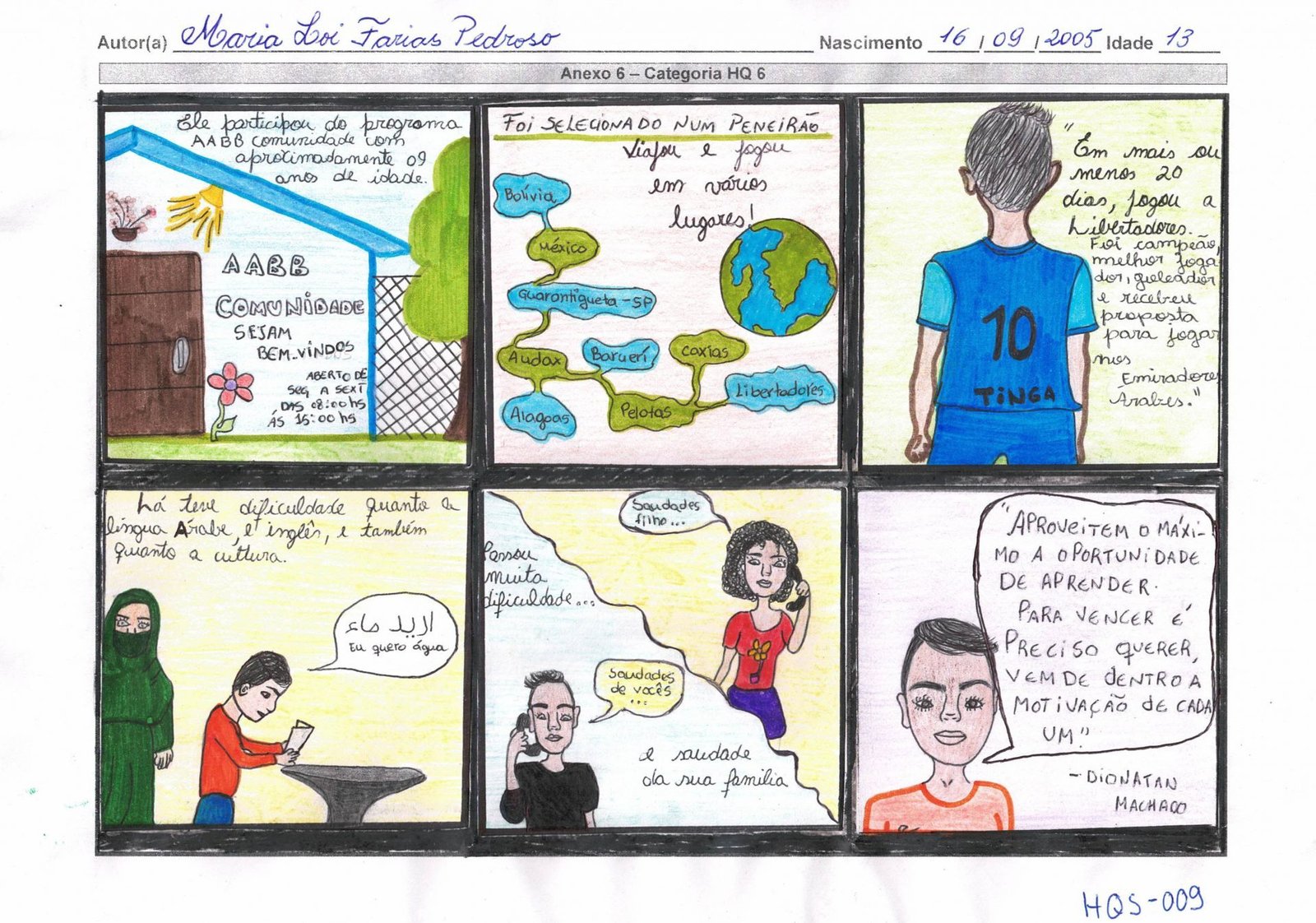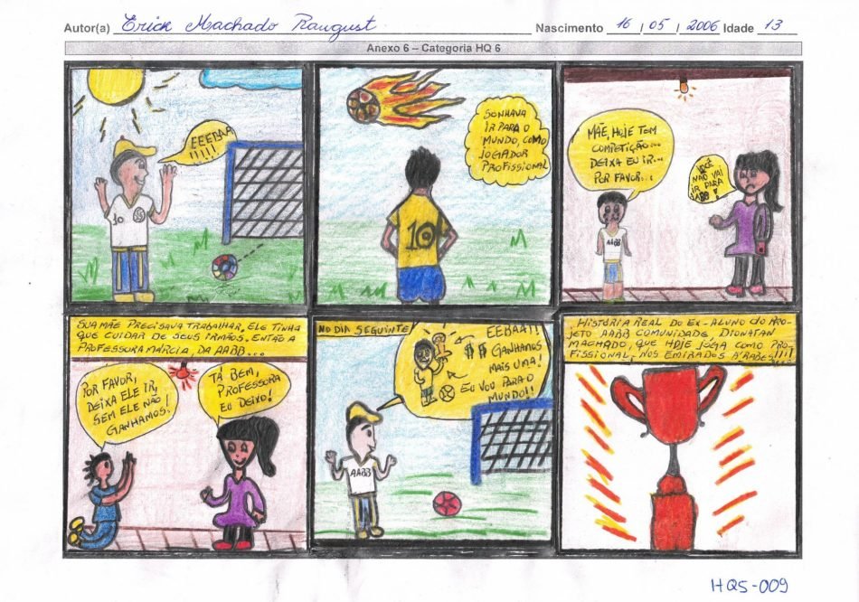 Os trabalhos escolhidos foram produzidos pelos alunos Erick Machado Raugust e Maria Loi Farias Pedroso, ambos com 13 anos, e fazem referência ao atleta e ex-aluno do projeto AABB Comunidade de Restinga Sêca, Dionatan Machado o “Tinga”, que hoje atua no futebol árabe.