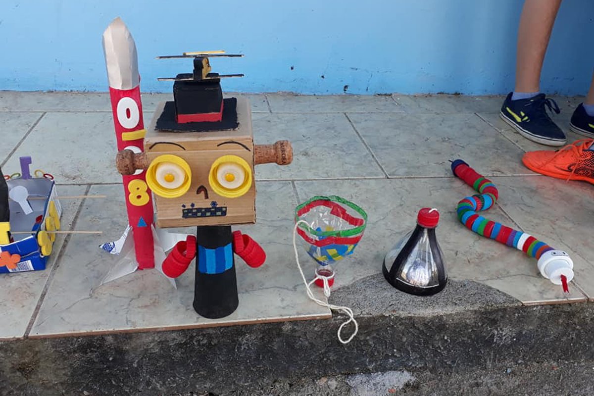Os brinquedos foram resultado de uma ação iniciada na Semana do Meio Ambiente. Os alunos foram desafiados pela professora a explorarem a criatividade, ao mesmo tempo em que desenvolvem uma conscientização com o meio ambiente, reciclando e criando algo novo do que poderia ser lixo.