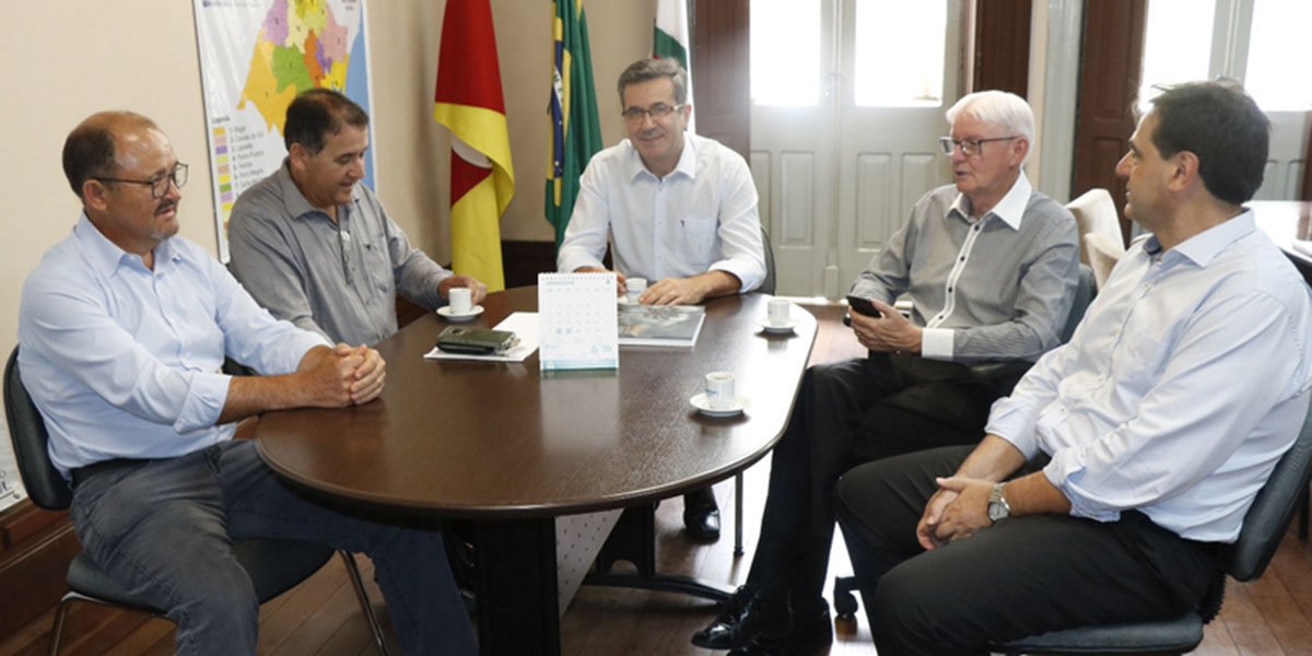 Na terça-feira, dia 4, o presidente da Afubra e o coordenador geral da Feira, acompanhados pelo presidente da Fetag, Carlos Joel da Silva, pelo vice-presidente Nestor Bonfanti, e pelo assessor de Política Agrícola e Agroindústria da Fetag, Jocimar Rabaioli, cumpriram agenda com o secretário de Estado da Agricultura, Pecuária e Desenvolvimento Rural, Covatti Filho. Na oportunidade, encaminharam a solicitação de apoio da Secretaria para o Pavilhão da Agricultura Familiar, durante a 20ª Expoagro Afubra. Werner e Dornelles também entregaram o convite da Feira ao Secretário e às lideranças da Fetag-RS.