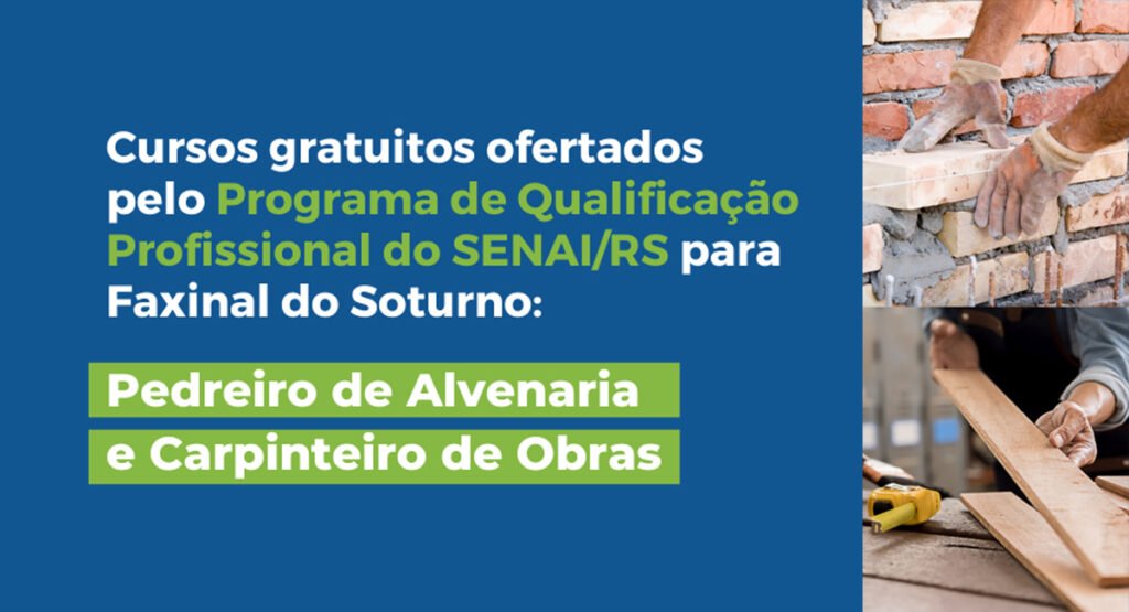 Os cursos de Pedreiro de Alvenaria e Carpinteiro de Obras, do Programa de Qualificação Profissional do Serviço Nacional de Aprendizagem Industrial do Rio Grande do Sul (SENAI/RS), serão ofertados em Faxinal do Soturno pelo Projeto Escola de Formação, do Centro de Referência de Assistência Social (CRAS) da Secretaria de Assistência Social, em parceria com o Sindicato da Indústria da Construção Civil de Santa Maria (SINDUSCON) e com o apoio da Associação Comercial, Industrial e de Serviços (ACIS) de Faxinal do Soturno.