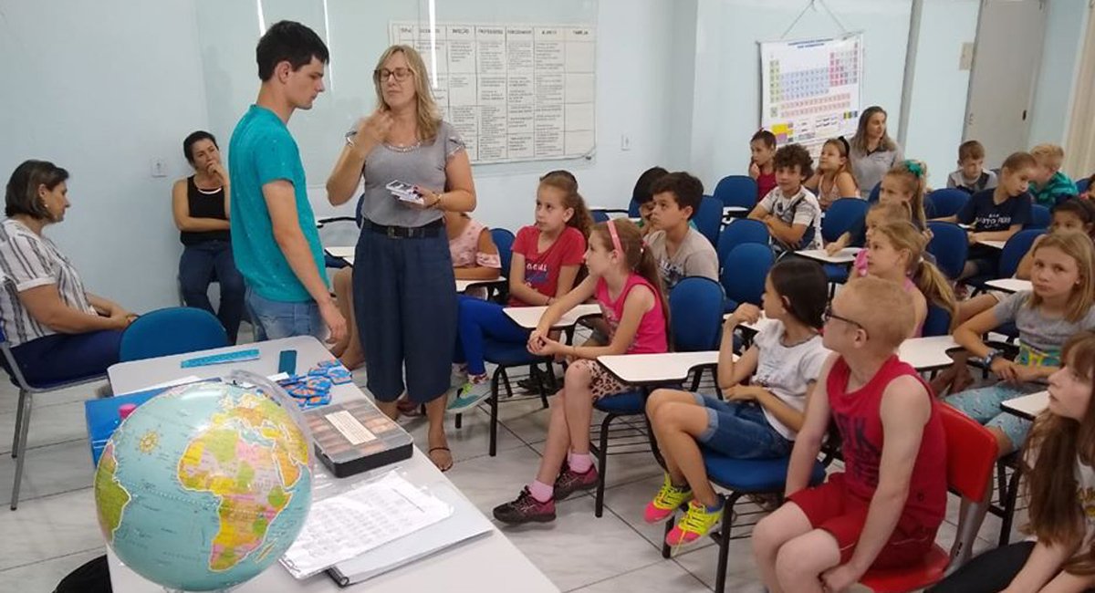 Acompanhada da educadora especial Sandra Barichello, a visita de Fabrício teve por objetivo o de apresentar e conversar com os estudantes agudenses sobre o seu material adaptado que utiliza no seu dia a dia como reglete, punção, guia, material didático, livros em braille, calculadora sonora, multiplano, entre outros.