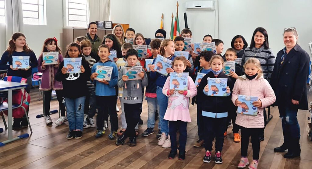 Na última terça-feira, dia 11, os alunos do 1º ao 5º Ano das escolas municipais e estaduais de Faxinal do Soturno receberam dois livros infantis: “Uma menina esquisita chamada Dina” e “A dinossaura Gnathovorax Azul”, de autoria da professora da Universidade Federal de Santa Maria (UFSM) Sueli Salva, com ilustrações dos estudantes Bruna Dotto e Guilherme Gomes.