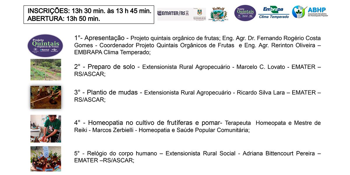 A implantação e manejo de pomar será o tema de um Dia de Campo na próxima sexta-feira, dia 23, em Paraíso do Sul. O evento é uma parceria entre Emater, Secretaria Municipal de Agricultura, Embrapa Clima Temperado, através do Projeto Quintais Orgânicos de Frutas e associação Brasileira de Homeopatia Popular.