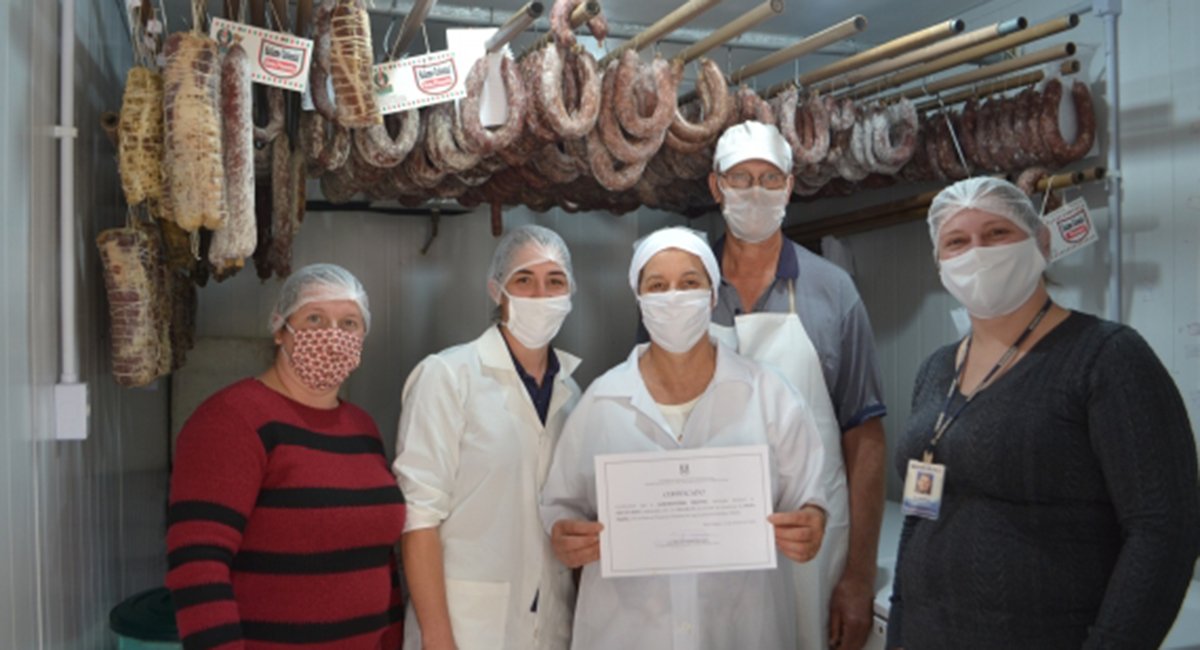 A chefe do escritório municipal da Emater, Sandra Denardin da Silva, acompanhada da representante da secretária de Agricultura, Clauciane Garlet Stefanello, e da médica veterinária responsável pelo Serviço de Inspeção Municipal no momento, Nara da Rosa Pegoraro, fizeram a entrega do Certificado aos proprietários da Agroindústria Rossato, Gilseo e Benilda Rossato, e aos proprietários da Agroindústria Binotto, Idair e Ângela Binotto.