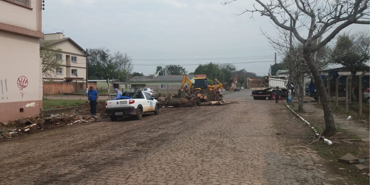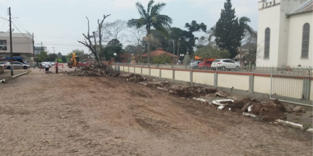 Quem passa pelas imediações da Igreja Matriz e Salão Paroquial de Restinga Sêca, não pode deixar de notar a ação da Secretaria de Obras, que trabalha na retirada das árvores da Rua José Celestino Alves, quadra entre as ruas Borges de Medeiros e Henrique Herzer.