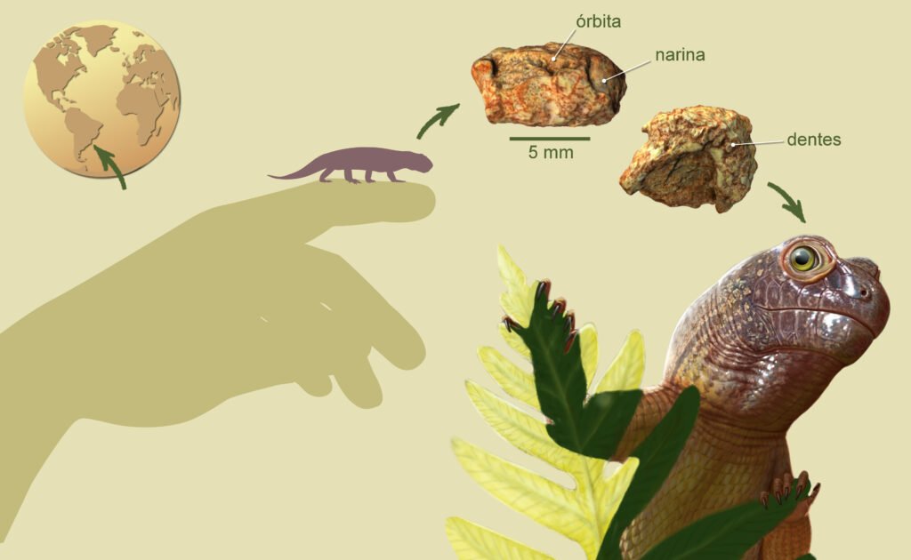 Foi nesse contexto que uma nova descoberta no sul do Brasil trouxe informações inéditas sobre esse enigmático grupo de vertebrados. O estudo, liderado pelo paleontólogo da UFSM Rodrigo Temp Müller, descreveu uma nova espécie de pararéptil, Sauropia macrorhinus, com base em um crânio quase completo medindo apenas 9,5 milímetros de comprimento, menor do que uma unha. Devido ao seu tamanho minúsculo, o exemplar é o menor tetrápode já registrado em depósitos triássicos da América do Sul.
