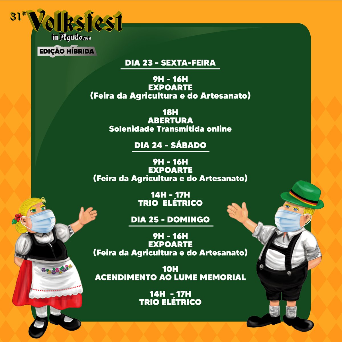 A 31ª edição da Volksfest in Agudo teve a programação divulgada na noite desta terça-feira, dia 6, pela Prefeitura de Agudo. Para este ano, o evento ocorrerá de forma híbrida, ou seja, pela internet e presencial.