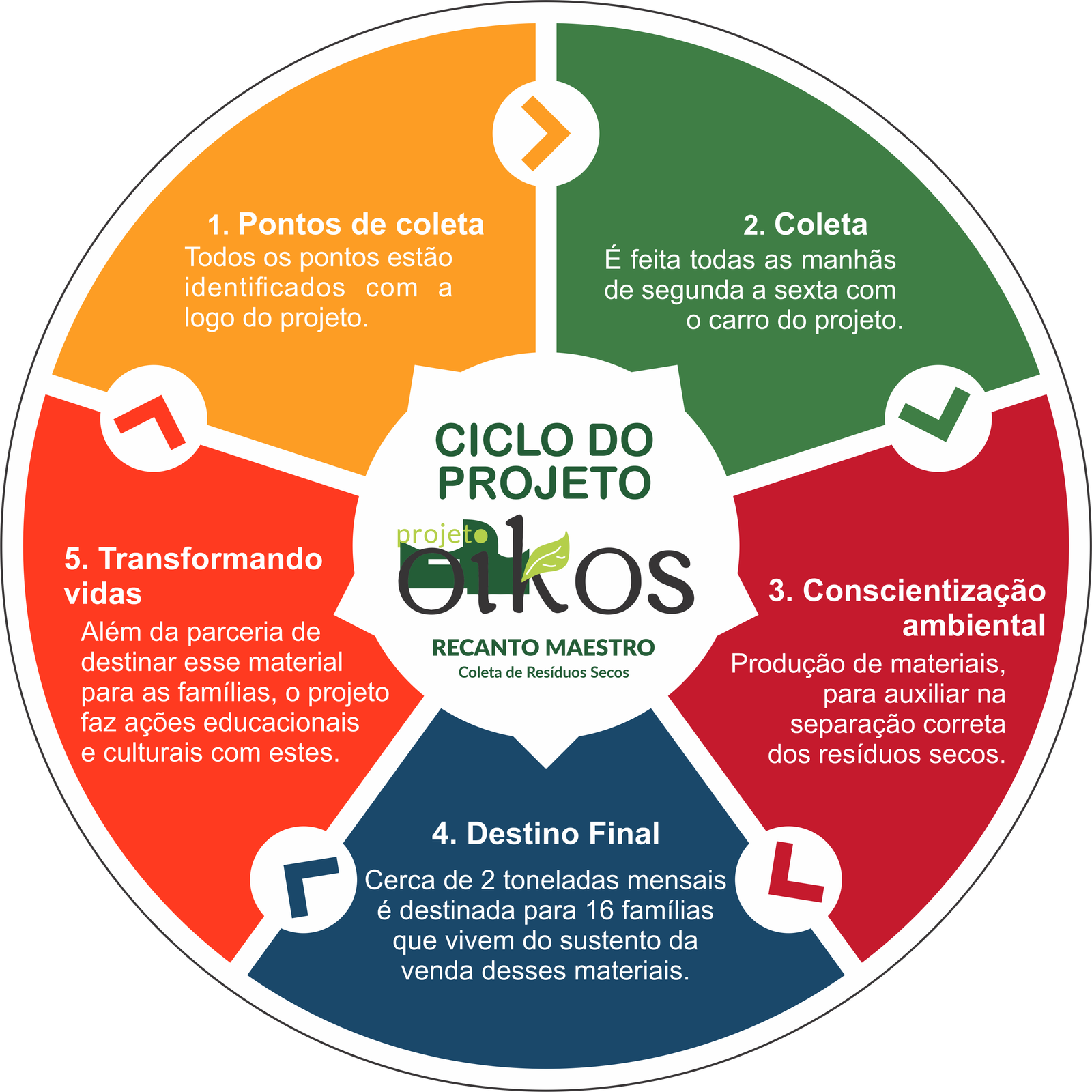 Todos os dias, um carro do Projeto OIKOS passa pelos 26 pontos de coleta seletiva no Recanto Maestro, retirando os sacos de lixo reciclado separados pelos moradores do distrito. No início deste segundo semestre, a novidade é que um mapa desses pontos de coleta, bem como, um calendário dos horários da coleta será divulgado para os moradores. A iniciativa encampada pela Fundação Antonio Meneghetti tem o cunho ecológico de promover a coleta seletiva de lixo. Porém, o que pouca gente sabe, é o amplo aspecto humano que esse projeto abrange.