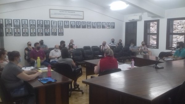 Integrantes da Secretaria Municipal de Agricultura de Nova Palma e representantes de agroindústrias do município estiveram reunidos na Câmara de Vereadores, juntamente com o prefeito, André Rossato, e o vice-prefeito, Valcenir Giovelli.