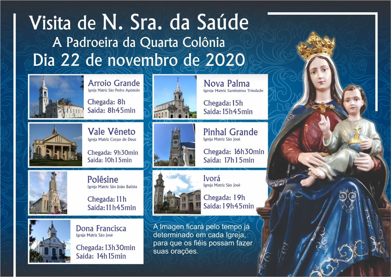 No domingo, dia 22 de novembro haverá visita da imagem de Nossa Senhora da Saúde às paróquias da região. 8h: Arroio Grande. 9h30min: Vale Vêneto. 11h: São João do Polêsine. 13h30min: Dona Francisca. 15h: Nova Palma. 16h30min: Pinhal Grande e 19h: Ivorá. A imagem ficará por 45 minutos em cada igreja para que os fiéis possam fazer suas orações.