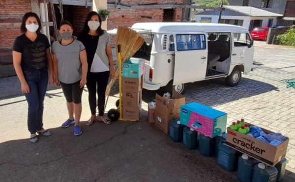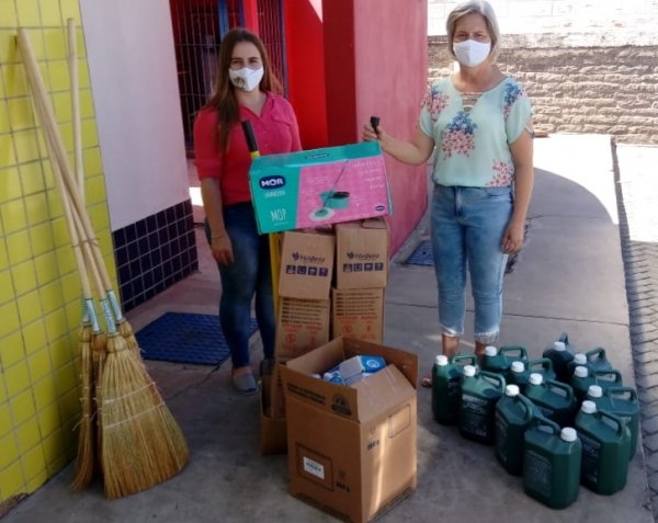 Ainda, a diretora da EMEI Aquarela, Maristela Dalla Nora, e a diretora da Escola Cândida Zasso, Cirlei Uliana, juntamente com a vice-diretora, Elisabete Saquet, e servidoras da escola, receberam material de higienização para o início do ano letivo, em entrega feita pela servidora da Secretaria de Educação, Marciani da Rocha.