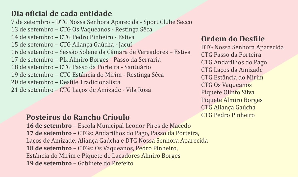Também dentro das festividades da Semana Farroupilha, no domingo, dia 15 tem desfile tradicionalista em Jacuí, a partir das 10h, seguido de almoço no CTG Aliança Gaúcha.