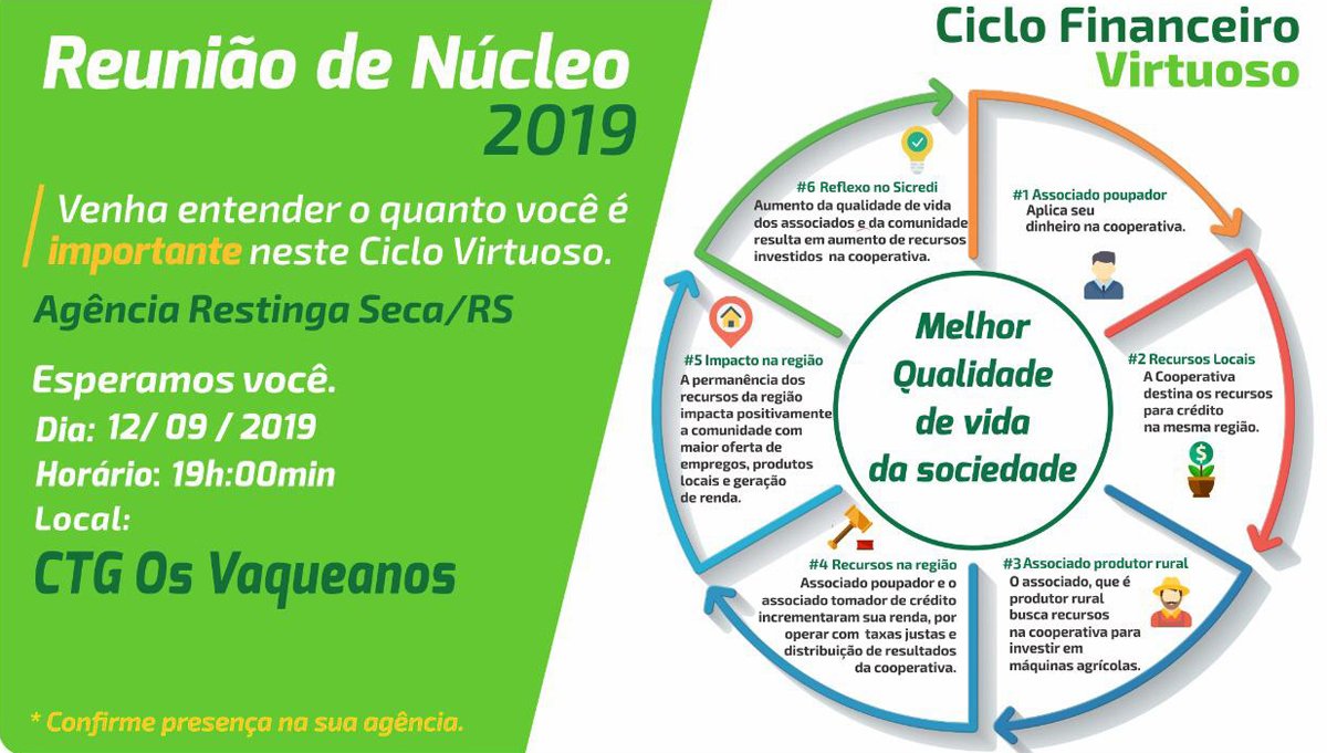 O Sicredi Região Centro RS/MG irá realizar na quinta-feira, dia 12, a Reunião de Núcleo 2019 da agência de Restinga Sêca. O evento inicia às 19h, no CTG Os Vaqueanos.